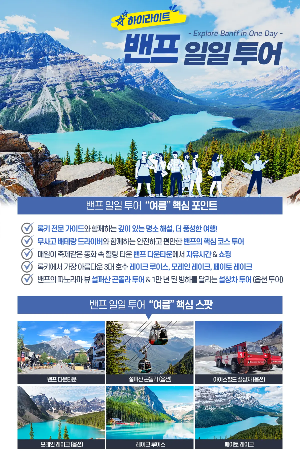 빙하가 녹은 물이 모인 페이토 호수는 록키에서 가장 높은 곳에 위치한 호수이며, 터키색 호숫물과 아름다운 주변 산의 경치로 방문객들을 매혹하는 곳입니다. 여름에는 영롱한 푸른 빛으로 빛나며 꼭대기에 눈이 쌓인 산으로 둘러싸인 모습이 장관을 이루어냅니다. / 7월~9월 출발 시에만 가능하며, 현지 사정에 따라 투어가 불가할 수도 있습니다.
